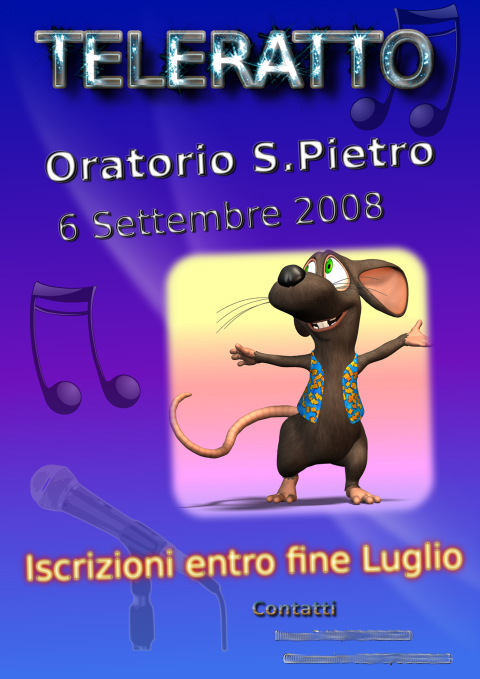 Ma prima i fatti: da una settimana X (l'amico non tanto amico, più conoscente da molti anni e con buoni rapporti, di cui preferisco non citare il nome) ha ricevuto il compito dal don di fare il volantino del Teleratto un evento canoro che si tiene a settembre in oratorio. Subito X si è rivolto a me per realizzarlo, e io tutto contento di sperimentare la potenza di GIMP e dell'Open Source ho accettato.
