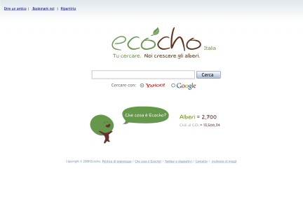 Attraverso DownloadBlog sono venuto a conoscenza di questo sito che per ogni 1000 ricerche promette di piantare fino a 2 piante per combattere l'inquinamento mondiale. Per effettuare le ricerche si appoggia sui motori di ricerca di Google e Yahoo, inoltre, a detta degli sviluppatori, utilizzando questo sito il tempo necessario alla ricerca non dovrebbe variare. L'obbiettivo di Ecocho è riassumibile in queste poche righe di Tim Macdonald
